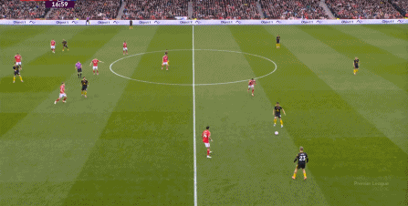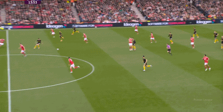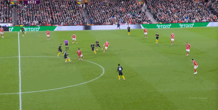 于是,最近这段时间看起来很好用的体系,在运转上出现了明显的问题,球队的进攻需要另辟蹊径,所以在30分钟前后,是布鲁诺和库尼亚这一侧,通过转移到右侧,让曼联形成了进攻: